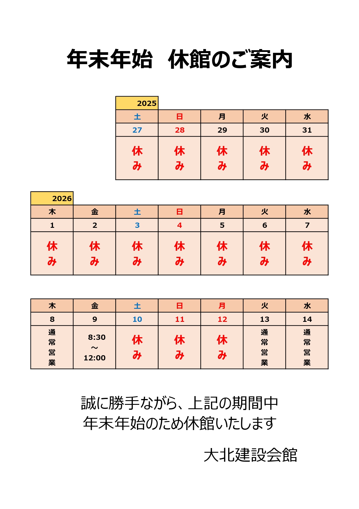年末年始の休館について 2025年12月19日 最終更新日時 : 2025年12月19日 大北支部 年末年始は下記の日程が休館しますご迷惑をおかけいたしますがよろしくお願いいたします 2025年12月27日(土)~2026年1月7日(水) 1月8日(木) 通常営業 1月9日(金) 12時~ 閉館